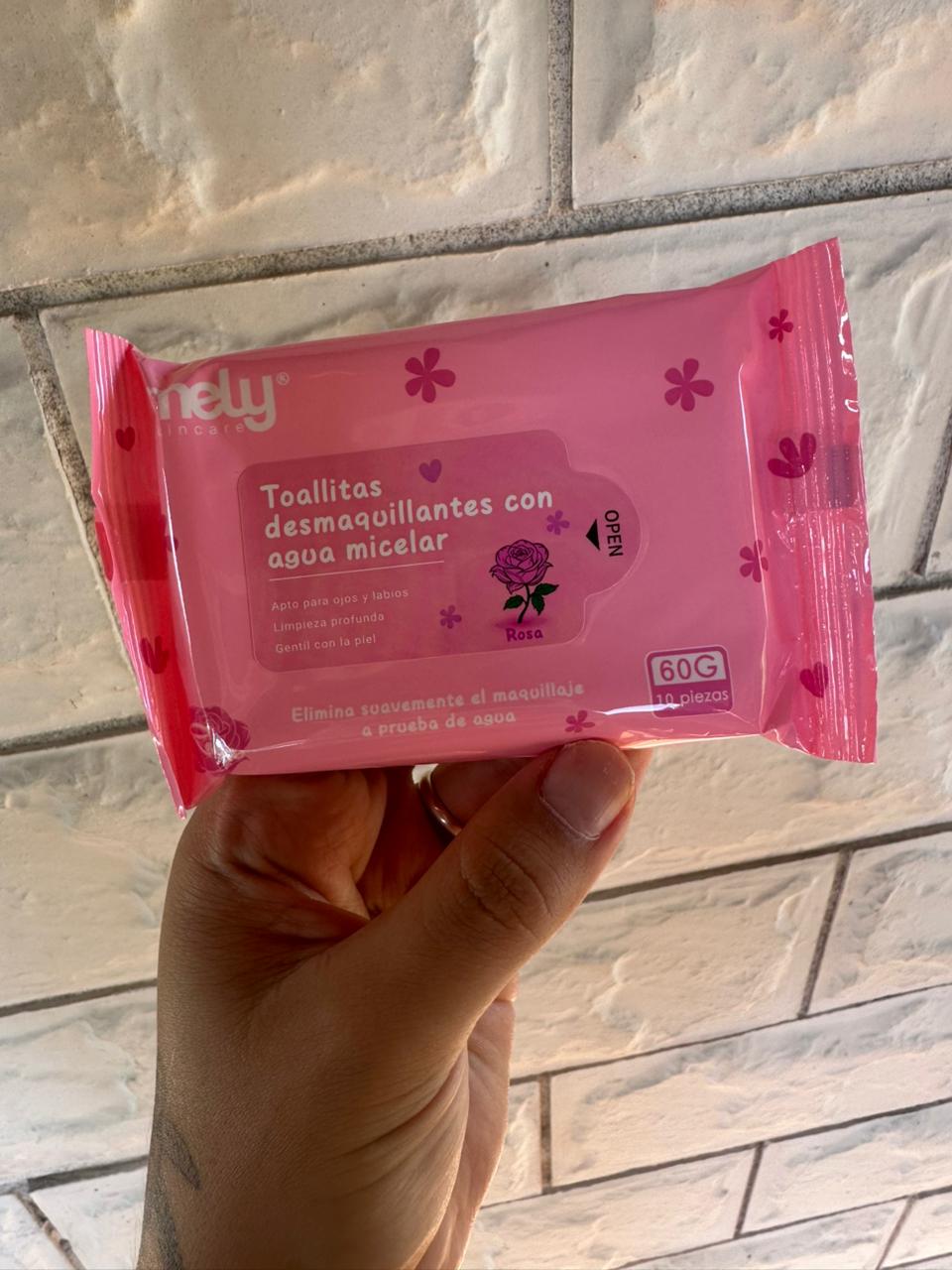 Con agua de rosas. Elimina maquillaje a prueba de agua. Contiene 10 toallitas.